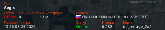 Играет на Counter Strike 1.6 сервере. Страна: РоссияПервый раз замечен 20:15 06.03.2026