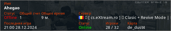 Играет на Counter Strike 1.6 сервере. Страна: РумынияПервый раз замечен 19:41 28.12.2024