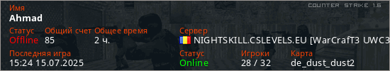 Последний раз был в сети 15:24 15.07.2025 Игрок с таким ником замечен на 28 серверах