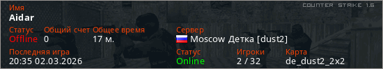 Играет на Counter Strike 1.6 сервере. Страна: РоссияПервый раз замечен 16:56 16.02.2026