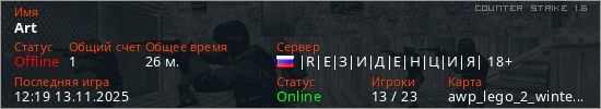 Последний раз был в сети 12:19 13.11.2025 Игрок с таким ником замечен на 41 сервере