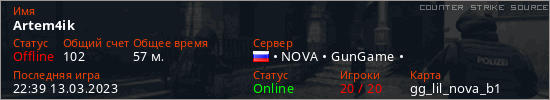 Играет на Counter Strike Source сервере. Страна: РоссияПервый раз замечен 17:23 11.12.2022