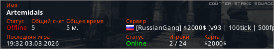 Играет на Counter Strike Source сервере. Страна: РоссияПервый раз замечен 19:27 03.03.2026