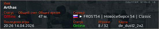 Играет на Counter Strike 1.6 сервере. Страна: РоссияПервый раз замечен 19:09 10.04.2026