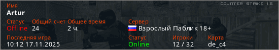 Играет на Counter Strike 1.6 сервере. Страна: РоссияПервый раз замечен 15:46 28.11.2023