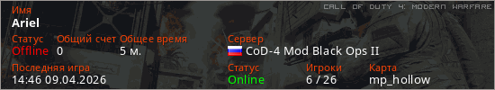 Играет на Call of Duty 4: Modern Warfare сервере. Страна: РоссияПервый раз замечен 14:44 09.04.2026