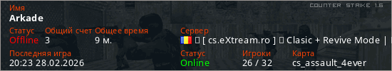 Играет на Counter Strike 1.6 сервере. Страна: РумынияПервый раз замечен 20:04 28.02.2026