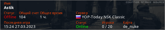 Играет на Counter Strike Source сервере. Страна: РоссияПервый раз замечен 14:36 08.03.2023