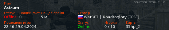 Играет на Counter Strike 1.6 сервере. Страна: РоссияПервый раз замечен 22:41 29.04.2024