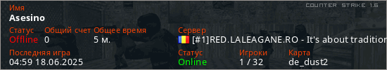 Играет на Counter Strike 1.6 сервере. Страна: РумынияПервый раз замечен 04:57 18.06.2025