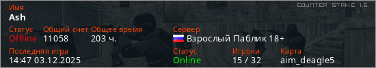 Играет на Counter Strike 1.6 сервере. Страна: РоссияПервый раз замечен 18:08 03.04.2021