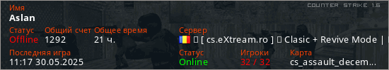 Играет на Counter Strike 1.6 сервере. Страна: РумынияПервый раз замечен 16:05 18.12.2024