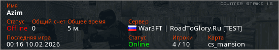 Играет на Counter Strike 1.6 сервере. Страна: РоссияПервый раз замечен 00:14 10.02.2026
