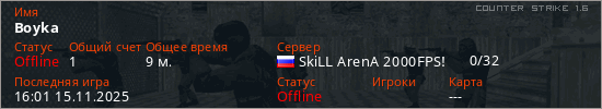 Играет на Counter Strike 1.6 сервере. Страна: РоссияПервый раз замечен 00:13 02.05.2023