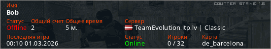 Играет на Counter Strike 1.6 сервере. Страна: ЛатвияПервый раз замечен 23:53 28.02.2026
