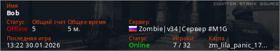 Играет на Counter Strike Source сервере. Страна: РоссияПервый раз замечен 13:20 30.01.2026