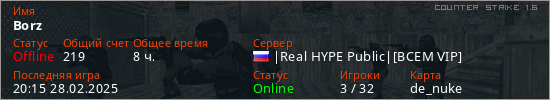 Играет на Counter Strike 1.6 сервере. Страна: РоссияПервый раз замечен 22:18 05.01.2025