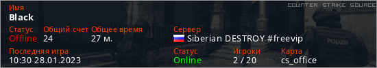 Играет на Counter Strike Source сервере. Страна: РоссияПервый раз замечен 10:05 28.01.2023