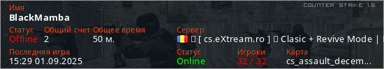 Играет на Counter Strike 1.6 сервере. Страна: РумынияПервый раз замечен 03:07 15.01.2025