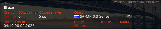 Играет на Criminal Russia Multiplayer сервере. Страна: РоссияПервый раз замечен 03:30 08.02.2026