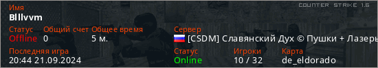 Играет на Counter Strike 1.6 сервере. Страна: РоссияПервый раз замечен 20:42 21.09.2024