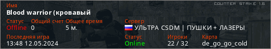 Играет на Counter Strike 1.6 сервере. Страна: РоссияПервый раз замечен 13:46 12.05.2024