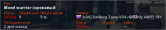 Играет на Counter Strike Source сервере. Страна: РоссияПервый раз замечен 11:35 19.04.2026