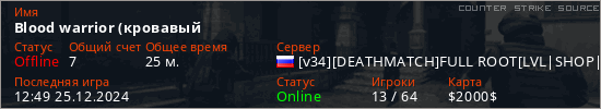 Играет на Counter Strike Source сервере. Страна: РоссияПервый раз замечен 14:35 22.11.2023