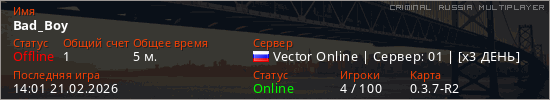 Играет на Criminal Russia Multiplayer сервере. Страна: РоссияПервый раз замечен 13:59 21.02.2026
