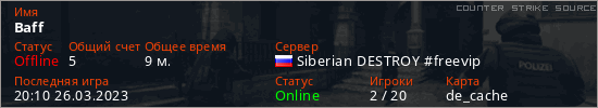 Играет на Counter Strike Source сервере. Страна: РоссияПервый раз замечен 19:47 26.03.2023