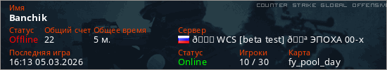 Играет на Counter Strike Global Offensive сервере. Страна: РоссияПервый раз замечен 16:11 05.03.2026