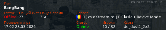 Играет на Counter Strike 1.6 сервере. Страна: РумынияПервый раз замечен 07:42 22.02.2026