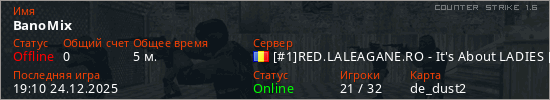 Играет на Counter Strike 1.6 сервере. Страна: РумынияПервый раз замечен 19:08 24.12.2025