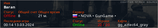 Играет на Counter Strike Source сервере. Страна: РоссияПервый раз замечен 14:49 19.04.2023