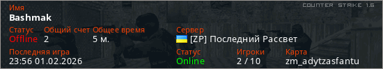 Играет на Counter Strike 1.6 сервере. Страна: УкраинаПервый раз замечен 23:05 01.02.2026