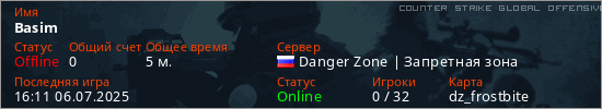 Играет на Counter Strike Global Offensive сервере. Страна: РоссияПервый раз замечен 15:57 06.07.2025