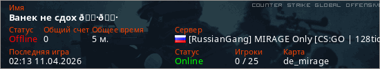 Играет на Counter Strike Global Offensive сервере. Страна: РоссияПервый раз замечен 01:31 11.04.2026