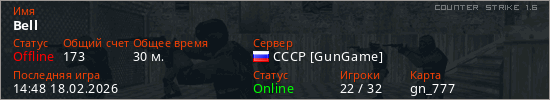 Играет на Counter Strike 1.6 сервере. Страна: РоссияПервый раз замечен 01:47 18.02.2026