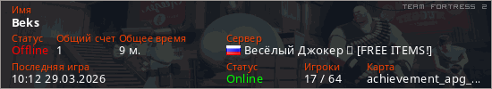 Играет на Team Fortress 2 сервере. Страна: РоссияПервый раз замечен 16:08 28.03.2026