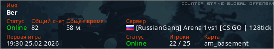 Играет на Counter Strike Global Offensive сервере. Страна: РоссияПервый раз замечен 19:30 25.02.2026