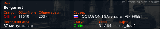 Играет на Counter Strike Source сервере. Страна: РоссияПервый раз замечен 10:43 13.01.2021