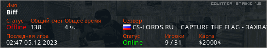 Играет на Counter Strike 1.6 сервере. Страна: РоссияПервый раз замечен 16:42 26.12.2022