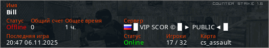 Играет на Counter Strike 1.6 сервере. Страна: РоссияПервый раз замечен 12:59 19.08.2025
