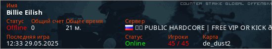 Играет на Counter Strike Global Offensive сервере. Страна: РоссияПервый раз замечен 18:15 05.05.2025