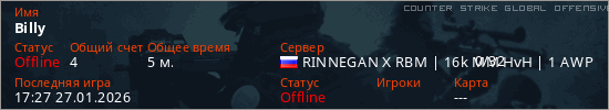 Играет на Counter Strike Global Offensive сервере. Страна: РоссияПервый раз замечен 17:16 27.01.2026