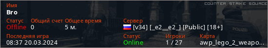 Играет на Counter Strike Source сервере. Страна: РоссияПервый раз замечен 08:29 20.03.2024
