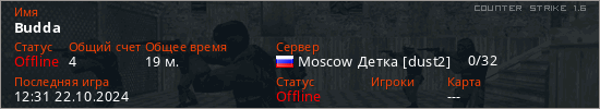 Играет на Counter Strike 1.6 сервере. Страна: РоссияПервый раз замечен 11:06 10.09.2022