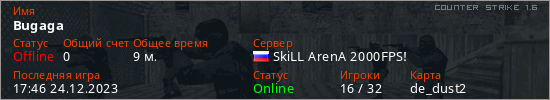 Играет на Counter Strike 1.6 сервере. Страна: РоссияПервый раз замечен 23:05 17.10.2023