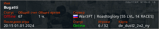 Играет на Counter Strike 1.6 сервере. Страна: РоссияПервый раз замечен 19:35 10.07.2022