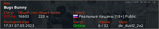 Играет на Counter Strike 1.6 сервере. Страна: РоссияПервый раз замечен 15:22 01.02.2023